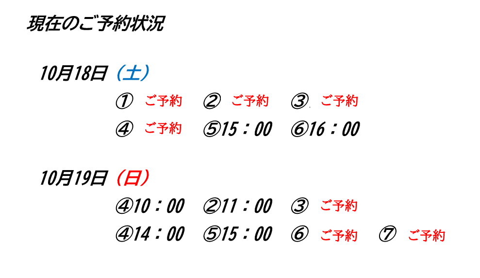 太良町完成見学会ご予約状況 2025/10/14 ブログ 太良町完成見学会がいよいよ今週末になりました♪ 18日(土)・19日(日)の現在のご予約状況になります ご案内できる枠が少なくなってまいりましたのでお早めにご連絡ください☺ 前へ